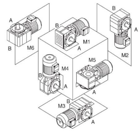 Motor M1 montado horizontalmente, la base de la unidad está en la parte inferior. El motor M2 está montado verticalmente hacia abajo. Motor M3 montado horizontalmente, la base de la unidad está en la parte superior. El motor M4 está montado verticalmente hacia arriba. Motor M5 montado horizontalmente, si se coloca en la posición M1, lado izquierdo de la unidad gira hacia abajo (punto de vista: hacia el lado del motor). Motor M6 montado horizontalmente, si se coloca en la posición M1, lado izquierdo de la unidad gira hacia arriba (punto de vista: hacia el lado del motor). | ![]() |