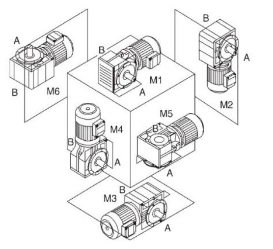 Motor M1 montado horizontalmente, la base de la unidad está en la parte inferior. El motor M2 está montado verticalmente hacia abajo. Motor M3 montado horizontalmente, la base de la unidad está en la parte superior. El motor M4 está montado verticalmente hacia arriba. Motor M5 montado horizontalmente, si se coloca en la posición M1, El lado izquierdo de la unidad gira hacia abajo (punto de vista: hacia el lado del motor). Motor M6 montado horizontalmente, si se coloca en la posición M1, El lado izquierdo de la unidad gira hacia arriba (punto de vista: hacia el lado del motor). | ![]() |